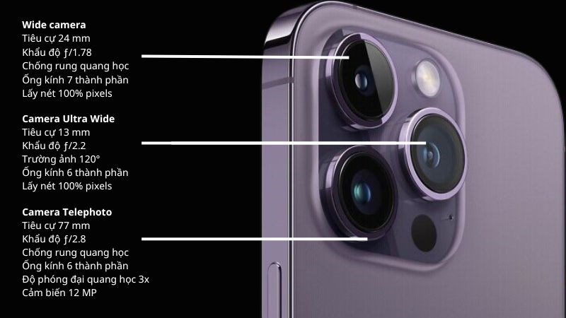 Camera Ultra Wide 12MP với góc nhìn 120 độ cho phép chụp những bức ảnh toàn cảnh ấn tượng, trong khi camera Telephoto 12MP với zoom quang học 3x mang lại khả năng chụp cận cảnh sắc nét.